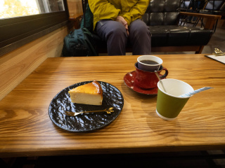 この後分岐に戻って周遊路を進むと根子岳山荘がでてきた。ぐるっと回る周回路を回って権現滝の展望所へ。こちらも水量が多く美しい。周回路を回って降りてくると再び根子岳山荘前にでてきた。小屋に入ってケーキセット。チーズケーキとコーヒー。どちらも絶品だ。根子岳山荘のTシャツを二人とも購入。根子岳山荘がんばってほしいな。
