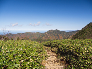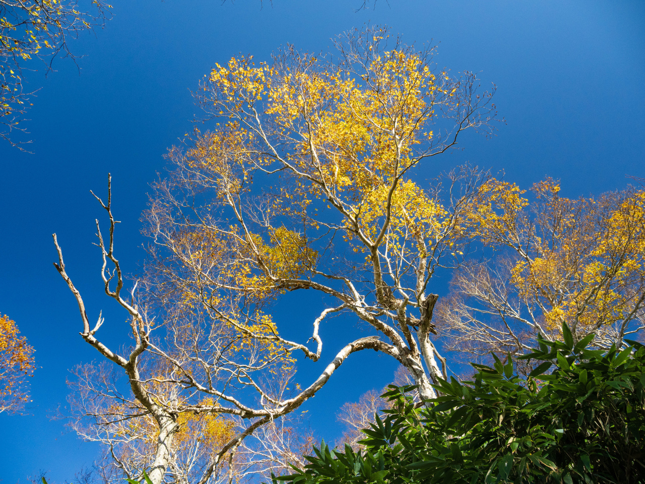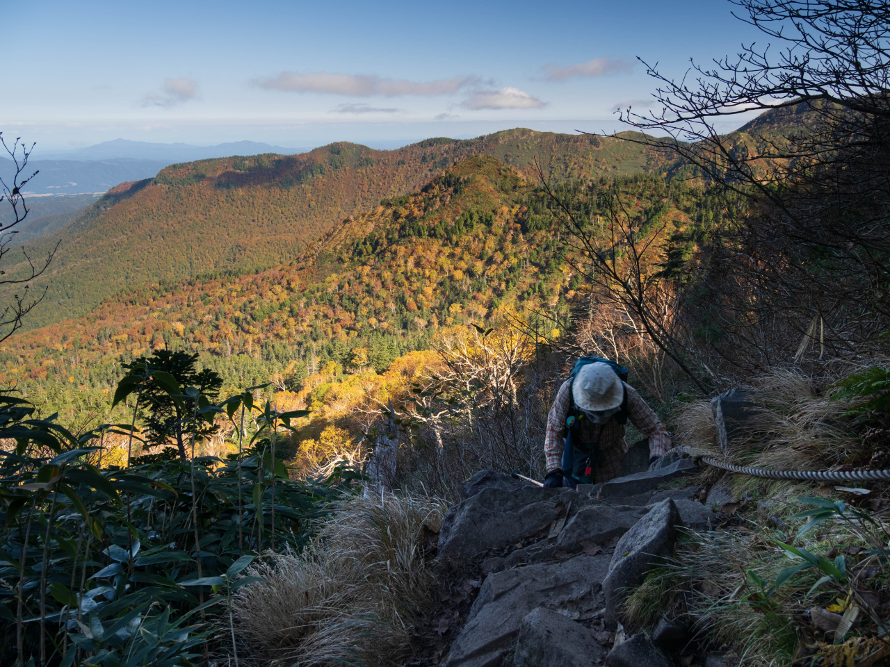 12時40分、山頂部を離れて急な下りの始まり。岩場は怖いというより楽しい感じ。六合目が近くなると紅葉帯へ。その向こうには米山、日本海、春に登った角田山。15時10分に駐車場へと戻ってきた。素晴らしいとは思っていたけど想像を越えていた苗場山だった。