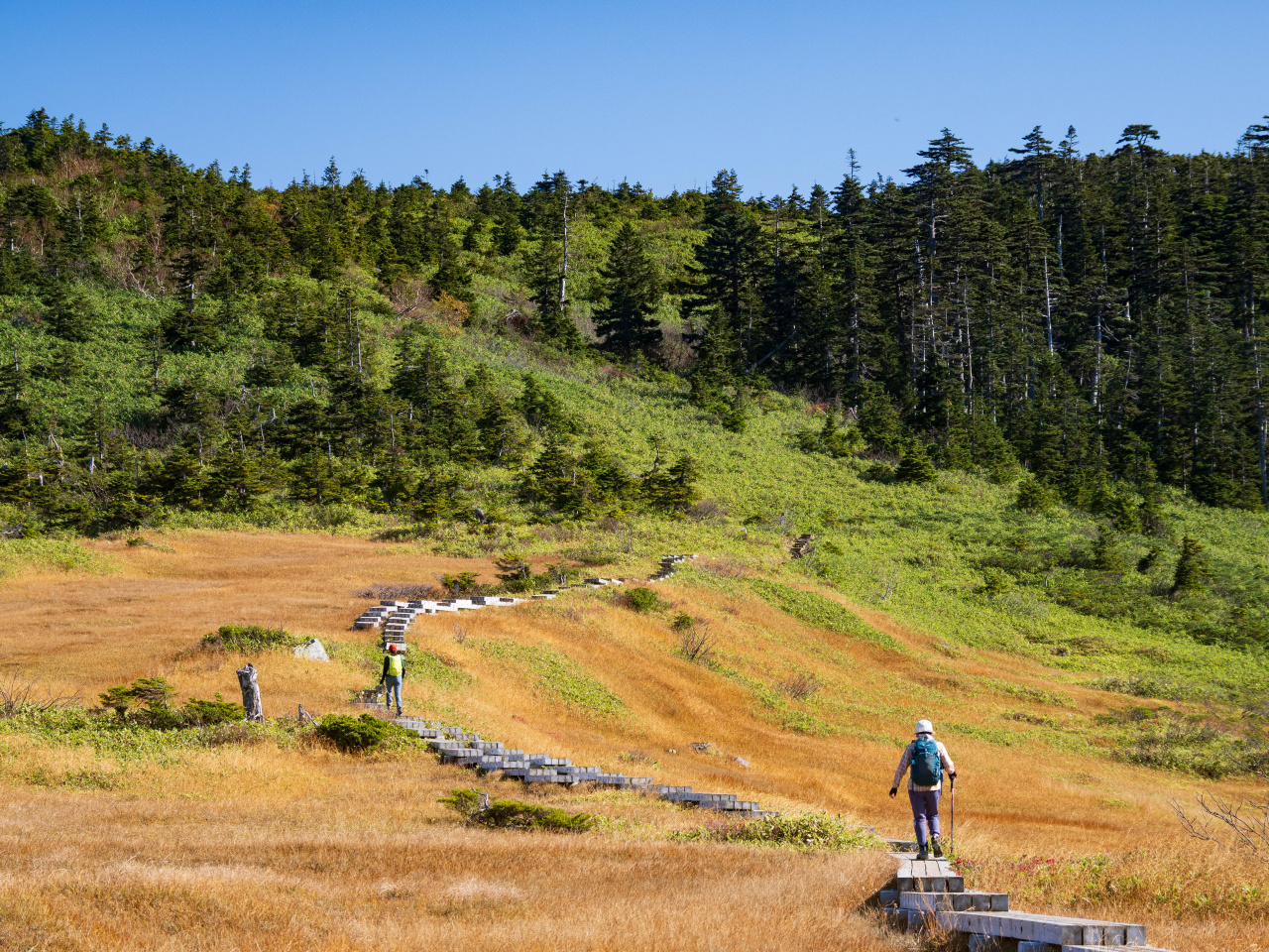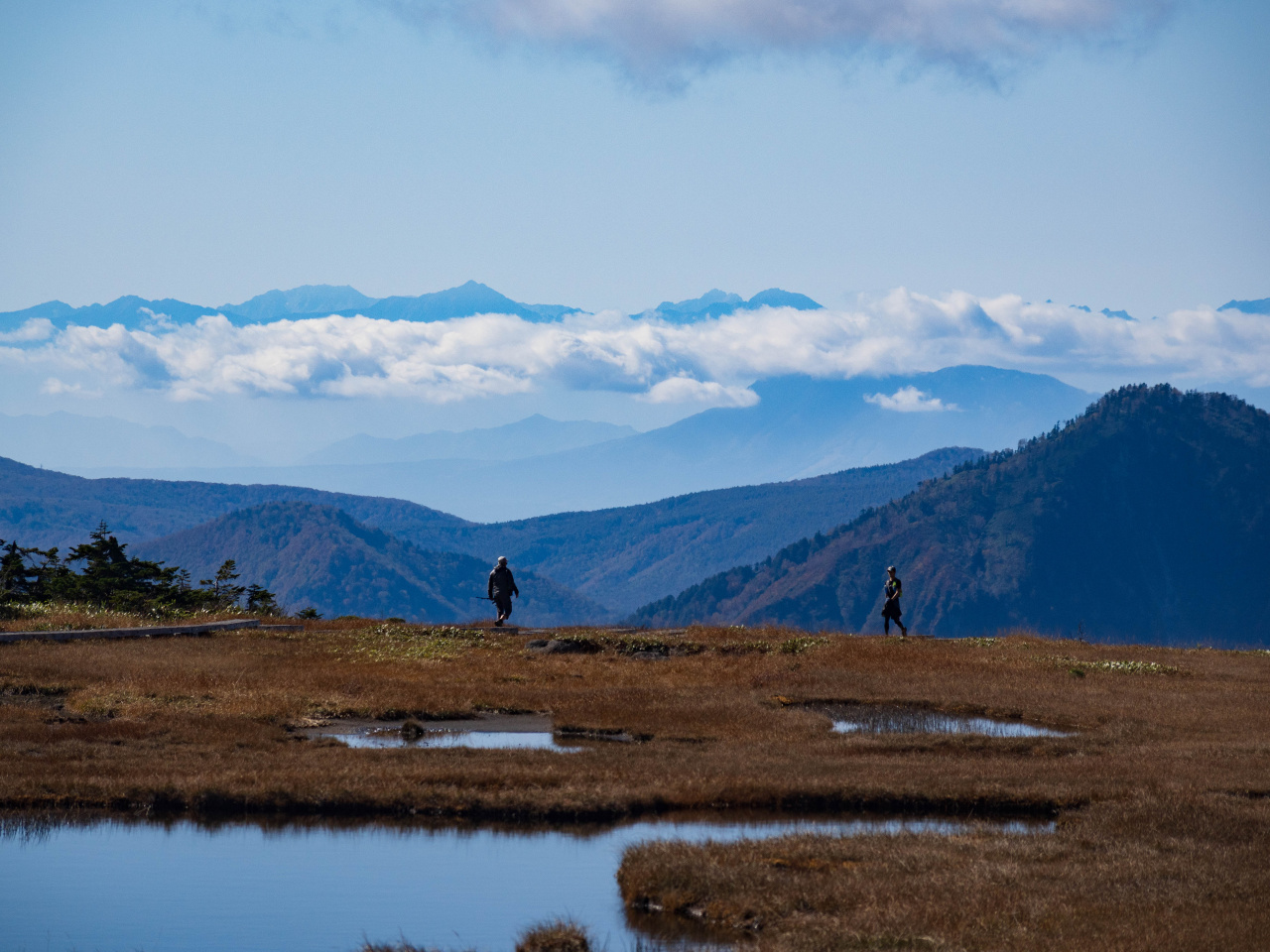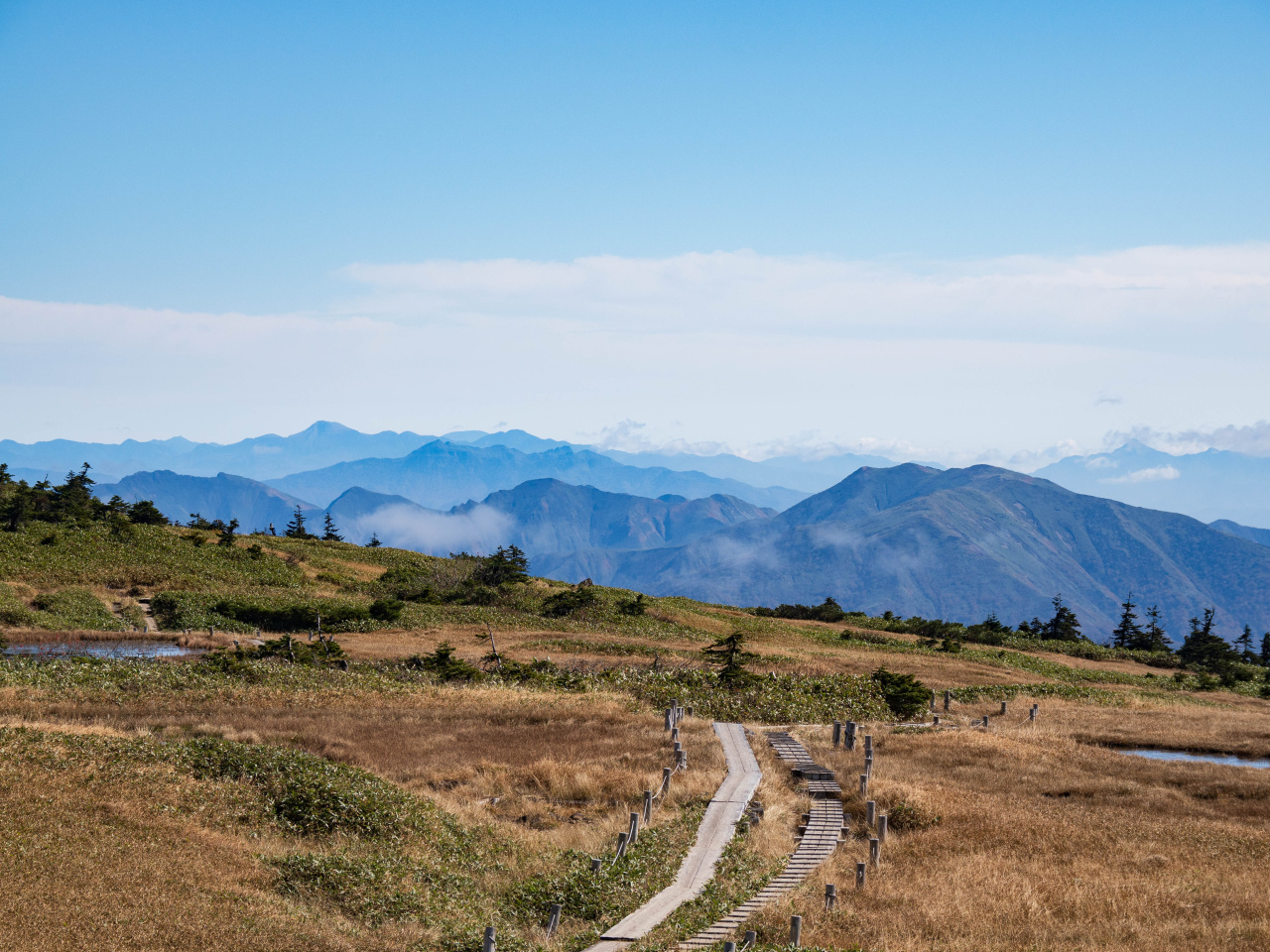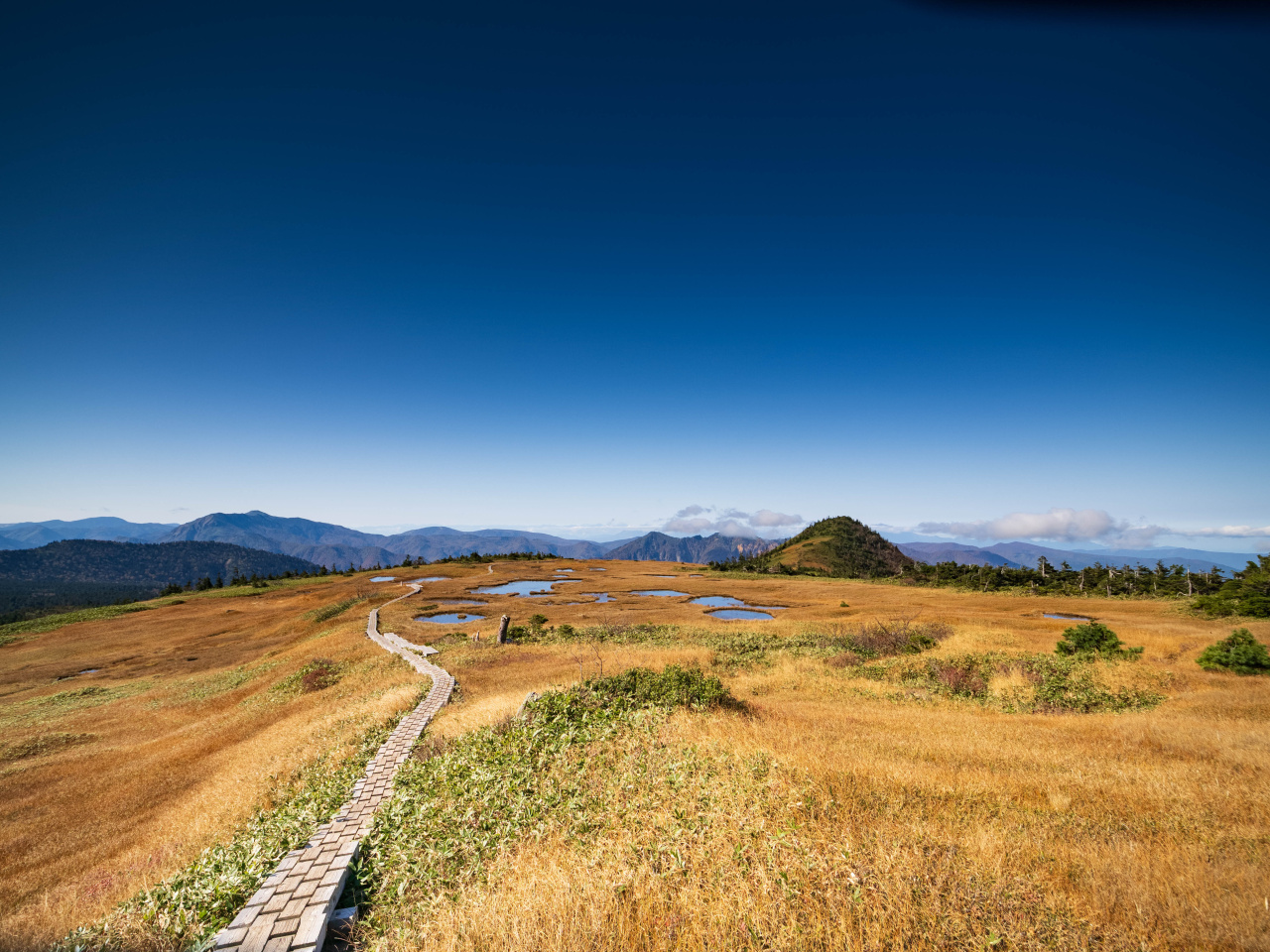 湿原に付けられた木道を進んでいく。雄大で気を付けないと時が過ぎるのを忘れて制止してしまいそうになる。湿原帯がおわり泥んこ帯へ。次は岩ゴロゴロ帯。そこを過ぎると再び湿原の中の木道へ。