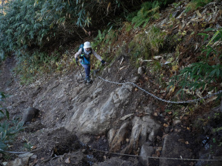 見上げると素晴らしい紅葉だ。日影になっているのが残念。7時に出発して登山口看板のところから小さな尾根道を登っていく。ここ数日の雨の影響か泥んこのところが多くてはまらぬよう右へ左へ。時々木道・丸木道がありぬかるんでいることが多いのかも。右手に滝がある。振り返ると狙っている新潟の名峰米山が見える。寒くてベストとウィンドブレーカーを着ていたが暑くなり脱いだ。