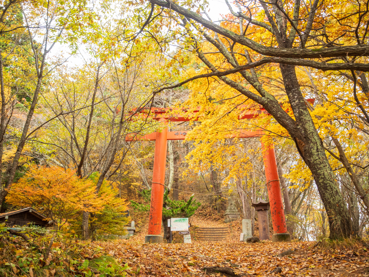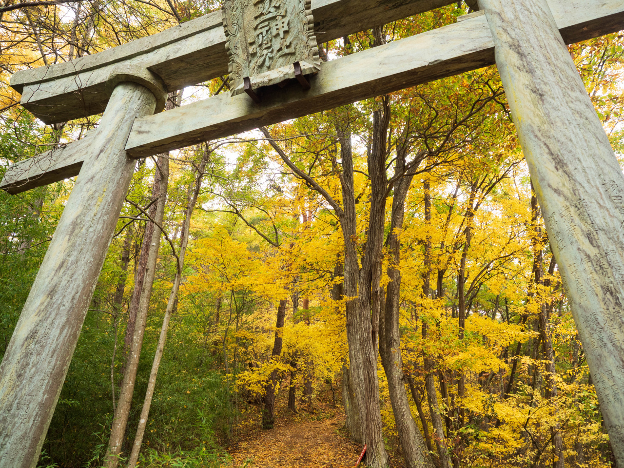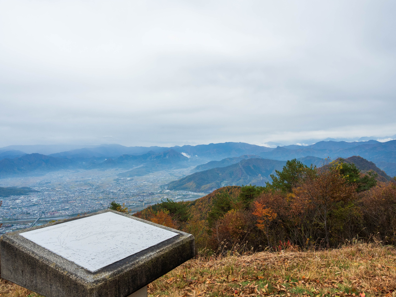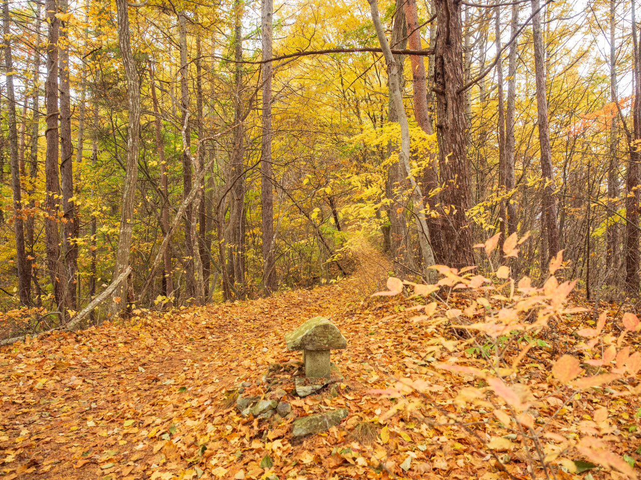 山頂へ向かう。誰もいない。北アルプスは雲をかぶっているのが見える。雪化粧している。いつ雨が降ってきてもおかしくないのですぐに降りる。赤の鳥居を過ぎて降りていくと雨が降ってきて石の鳥居手前で傘をさしておりる。なんとかずぶぬれにはならずに登山口まで降りることができた。