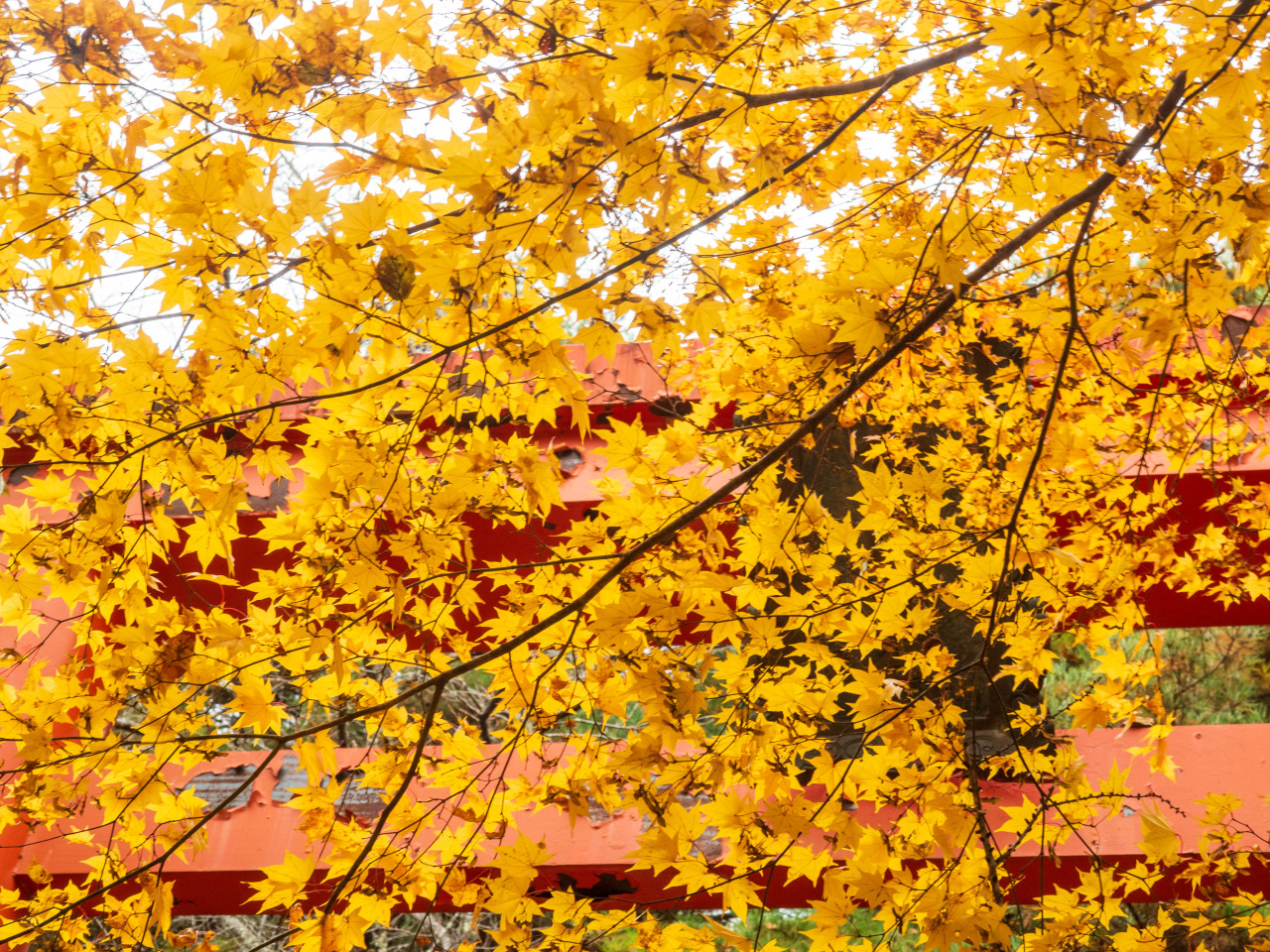 紅葉オンパレードで進まない。石の鳥居の先で少しおちついて?再び紅葉オンパレード。こんなにすごいんだとびっくり。土曜日だったら天気が良くていいのになあとまあ休みのたびに紅葉みれているんだから欲張りすぎか。