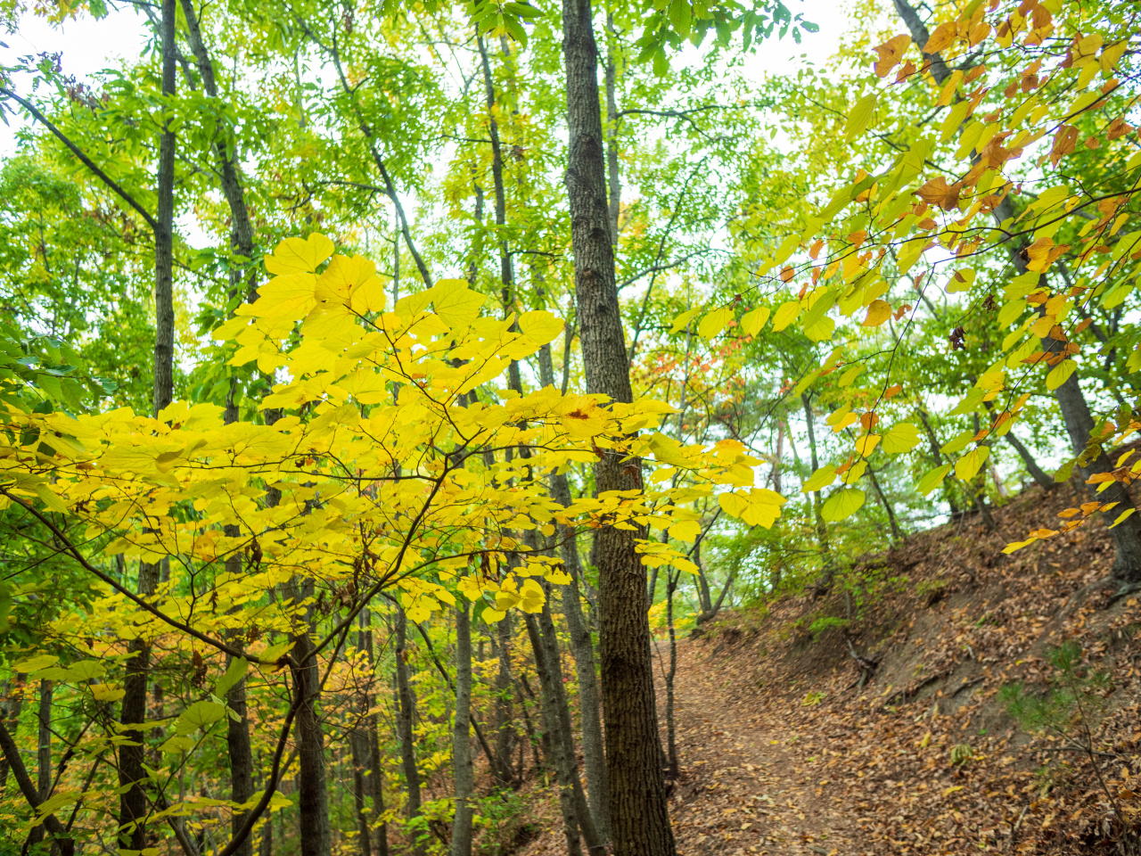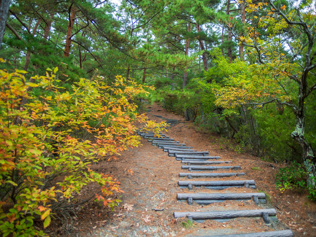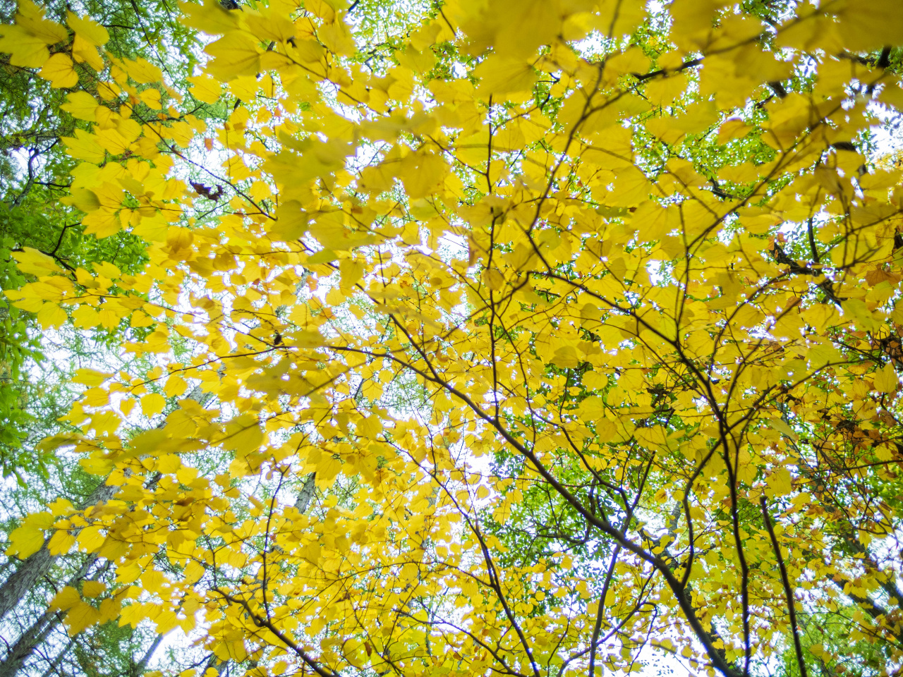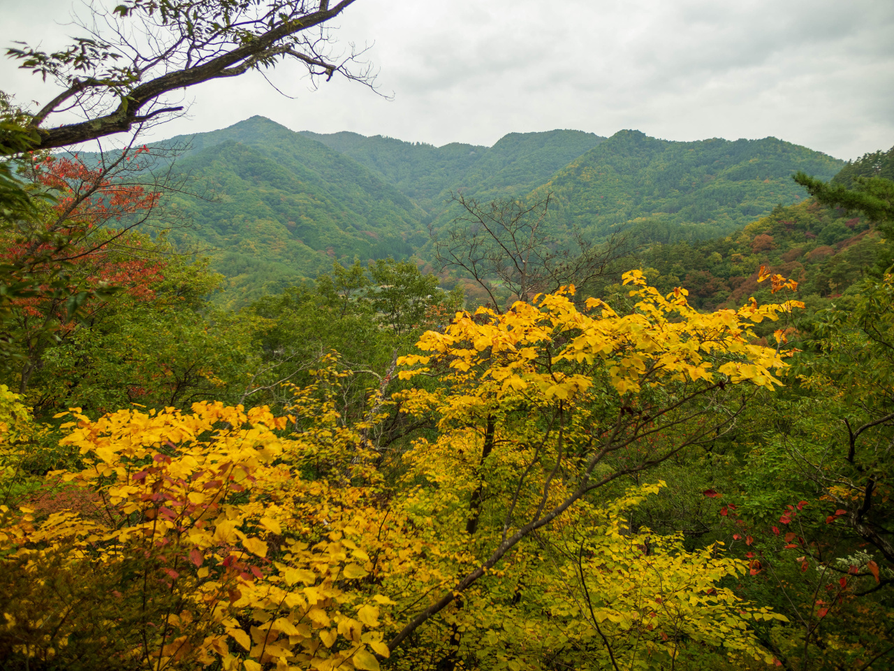 東屋からかろうじて常念岳が見える。槍や穂高連峰は見えない。尾根の両サイドにビニールテープが張ってある。松茸シーズンにつき登山道以外は進入禁止だ。黄色に紅葉している木がたくさんある。グーグルレンズで調べたらダンコウバイ・トリネコとでた。ダンコウバイは多く黄色く紅葉していてきれい。