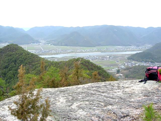 | 岩場では展望が開け吉井川と麓の市街地が箱庭のようにみえる |